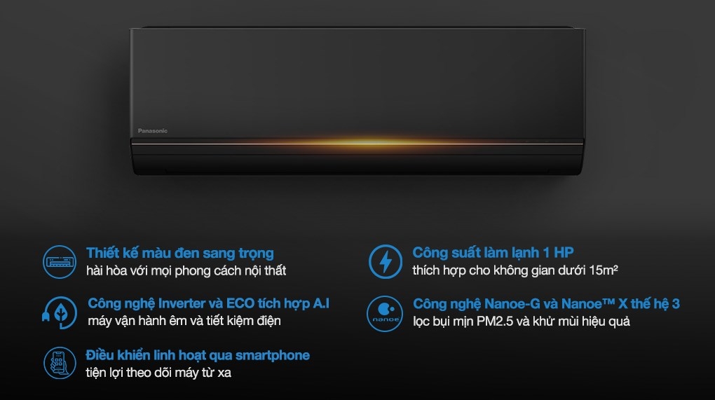 Máy lạnh Panasonic Inverter 1 HP CU/CS-AU9BKH-8 là lựa chọn lý tưởng cho các không gian nhỏ dưới 15m², như phòng ngủ hoặc phòng làm việc cá nhân. Sản phẩm gây ấn tượng với thiết kế đen nhám sang trọng, dễ dàng hòa hợp với nhiều phong cách nội thất hiện đại. Nhờ công nghệ Inverter kết hợp ECO A.I, máy vận hành êm ái, tiết kiệm điện và duy trì hơi lạnh ổn định. Bộ lọc Nanoe-G và Nanoe™ X thế hệ 3 giúp loại bỏ bụi mịn PM2.5, khử mùi và ức chế vi khuẩn, mang đến bầu không khí trong lành hơn.
